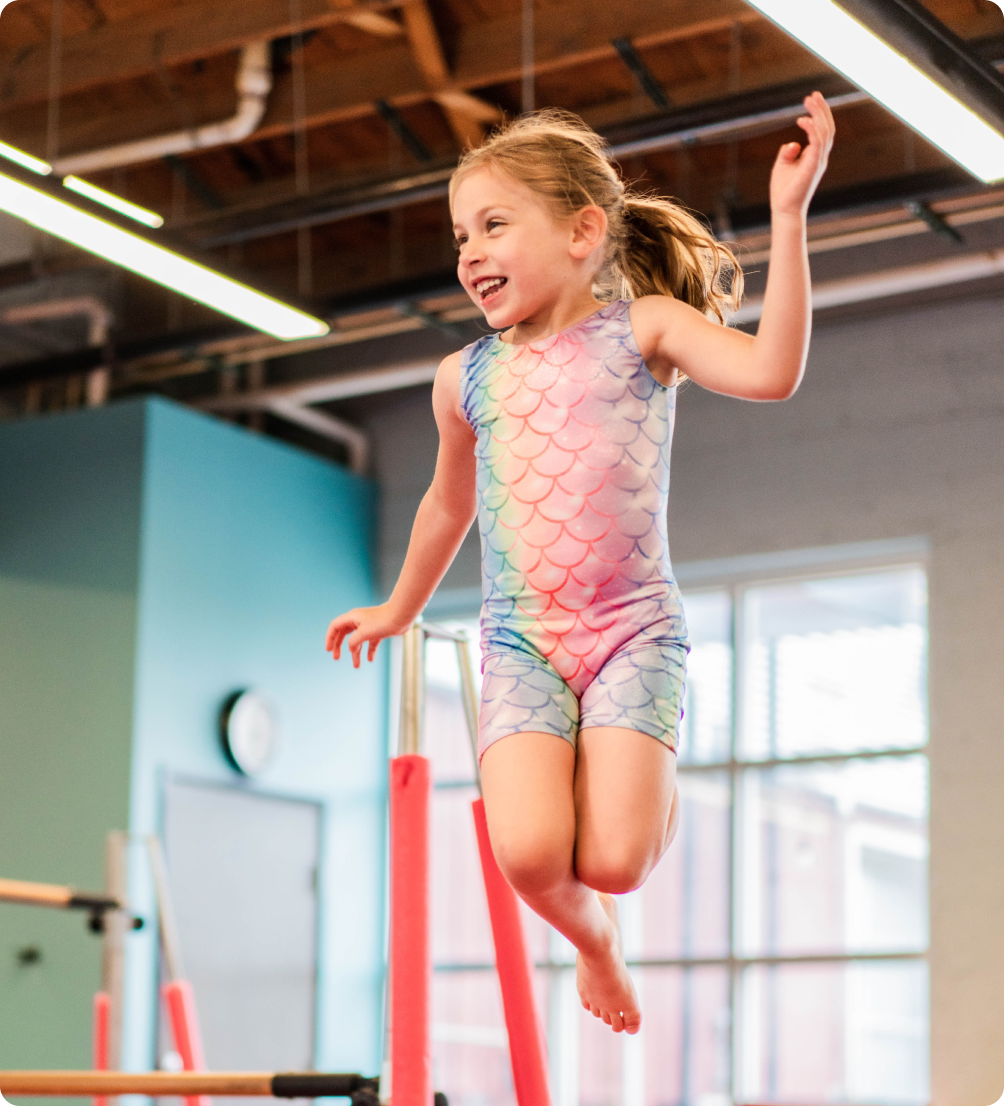 This class is the perfect transition for your child’s first independent class. The smaller class size will allow your child to adapt to being on their own by emphasizing listening, following instructions, and becoming more comfortable taking turns. In this toddler gymnastics class, your child will learn these benefits all while learning basic gymnastics skills.